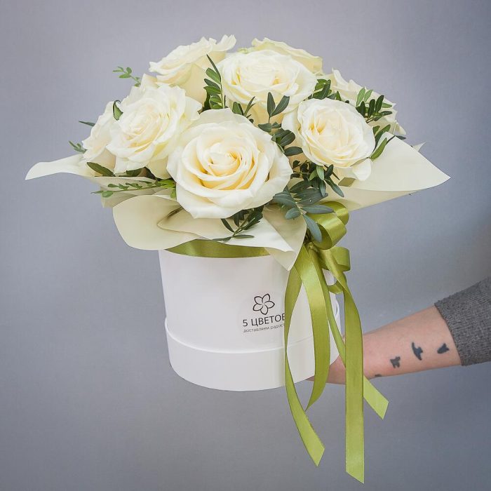 Роза белая – 9 шт.Коробка шляпная – 1 шт.
